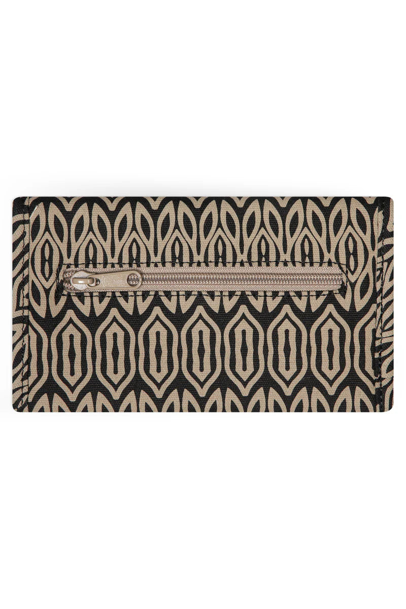 Tri-fold wallet, snap closure, one external zip pocket, internal checkbook and pen holder, multiple internal cash, card, ID slots.