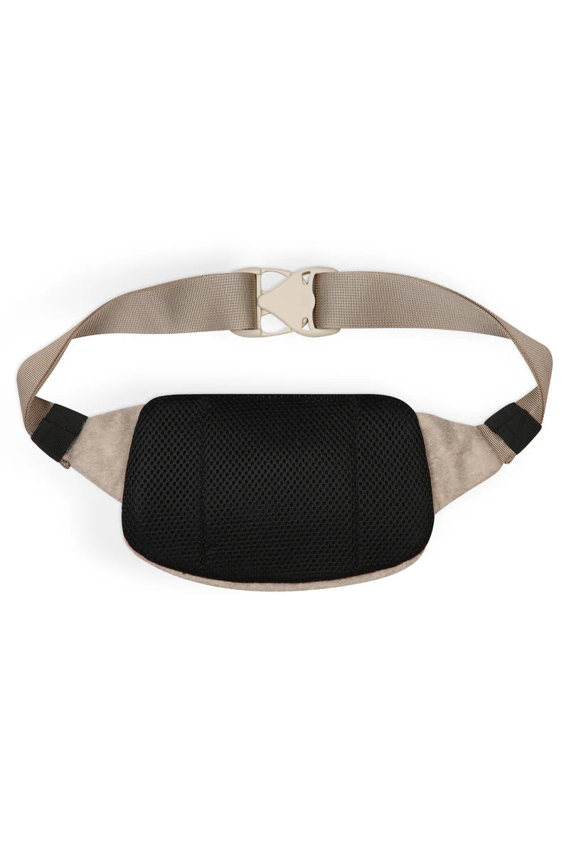 Belt bag with adjustable straps and side release buckle, two compartment design with zip closure, padded back panel.