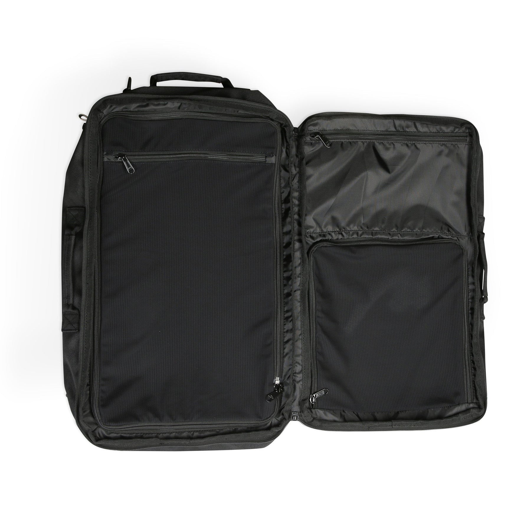 The ultimate backpack travel hauler, clam-shell style main compartment with two-way zip closure and side entry access with padded laptop sleeve, adjustable padded backpack shoulder straps that can store in zip pocket when not in use and it's easy to check on an airplane, chest straps with side release buckles, plastic D-ring and spring hook hardware, one fixed hand strap at top and two grab handles on each side, soft lined top zip pocket with key fob, one large billowed front zip pocket with daisy chain pattern webbing detail, side mesh pocket, padded bottom and back panel with hidden security zip pocket, rope loop zip pulls, main compartment fully opens flat to a multi compartment organizational design (one small detail pocket, two zip mesh pockets and one removable mesh laundry bag).