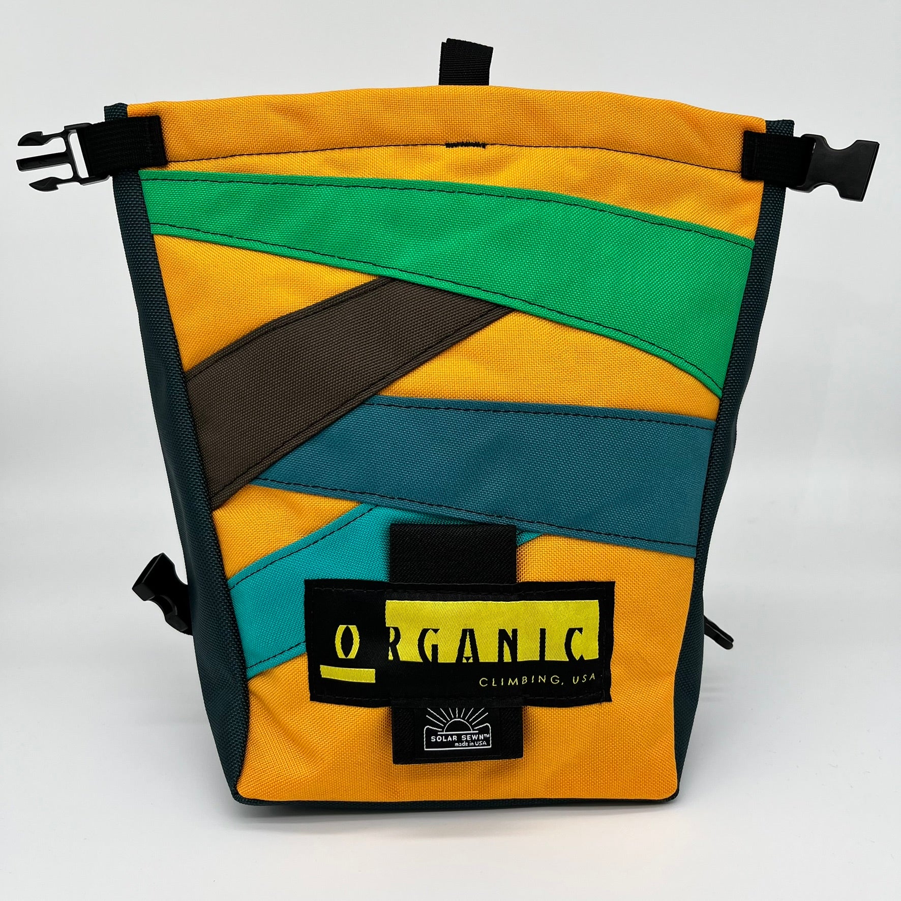 Super soft fleece lined throughout bag, large bar tack reinforced grab handle on back of bag for easy grabbing between burns. 1" Hook and Loop closure along the rim, Rolls down and securely clips closed to seal chalk in tight.