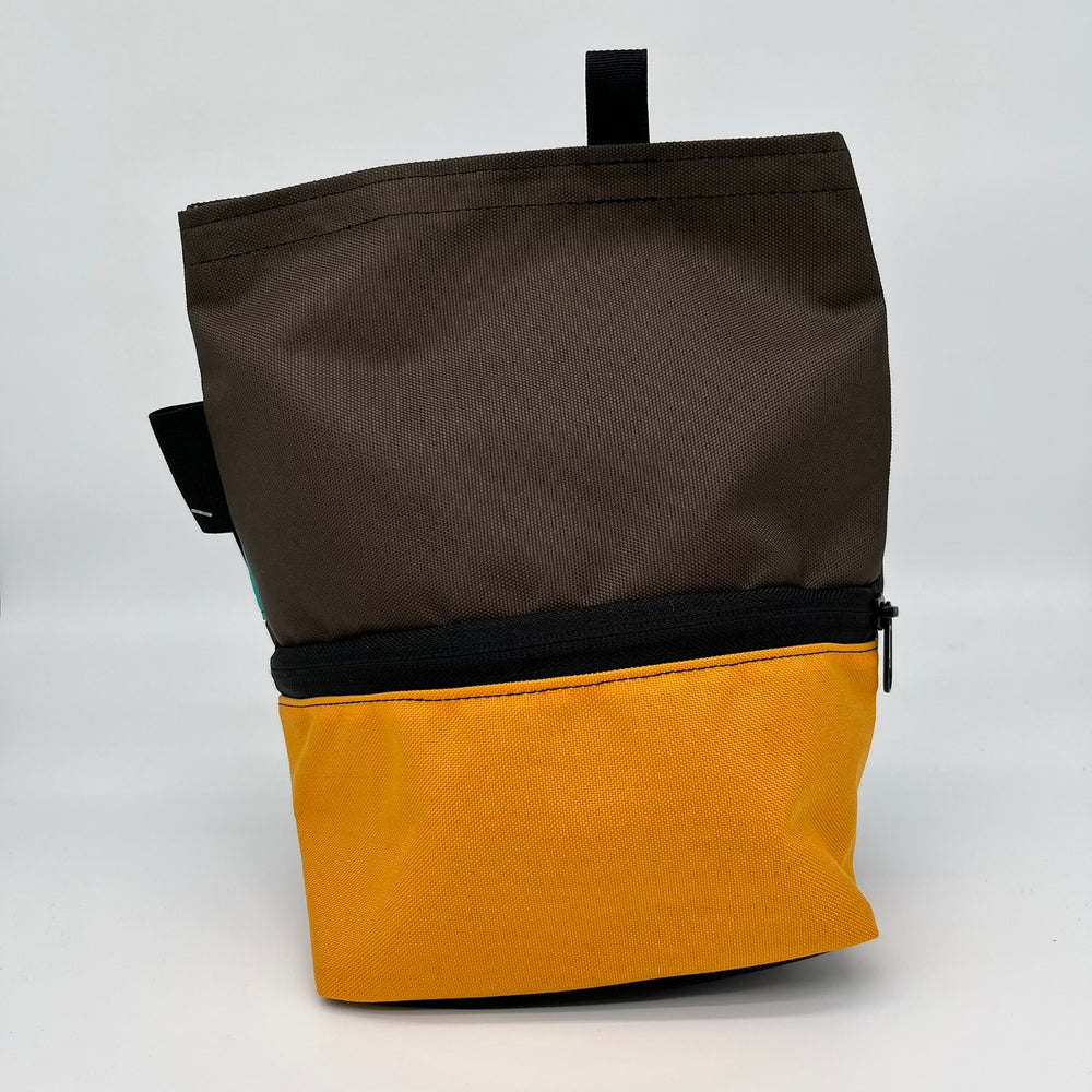 Our time-tested iconic bucket design provides a secure warehouse for your chalk supply. Burly 1200d Recycled Cordura fabric is stiff, ensuring the Lunch Bag Bucket stays open while you're bouldering. The bag seals with a ¾” hook and loop and then rolls down and clips like a boater's dry bag securely closed with an discrete hook buckle . A big outer pocket, two elastic brush-loops and signature Organic colors round out this stylish, user-friendly bouldering necessity. Made from your choice of custom colors in one-of-a-kind designs created by recycling our cutting scraps!